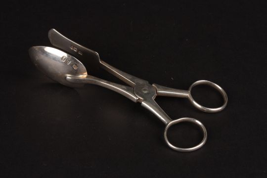 A pair of George IV silver egg tongs hallmarked London 1829, of plain form with looped handles, Maker: William Eaton., 2.3 ozt.Condition: Good condition.