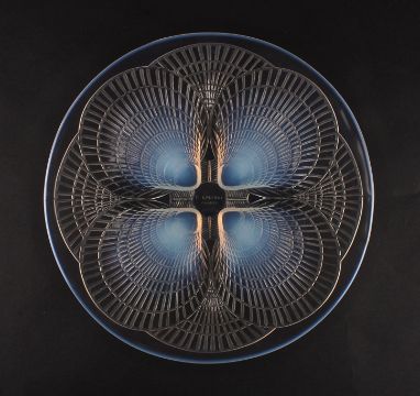 A Lalique Coquilles opalescent glass dish decorated with four scallop shaped shells, with wheel cut signature R. Lalique, France and numbered P00E., 29.9 cm diameter.Condition: Good condition.