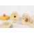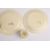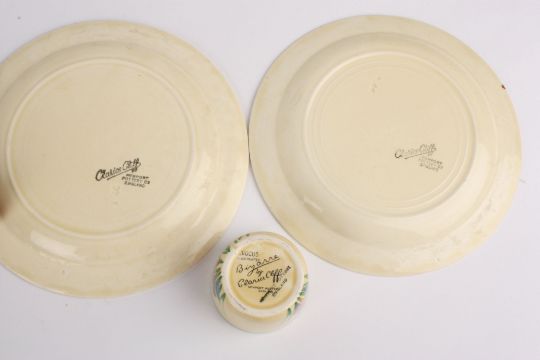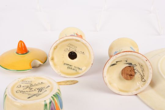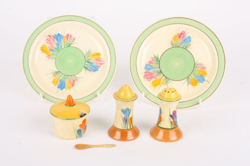 A Clarice Cliff Bizarre Crocus pattern three piece cruet set comprising a salt, pepper and mustard pot, together with a pair of Crocus pattern circular saucers with green centres. (5), Condition: Generally good condition, few minor paint nicks in places.