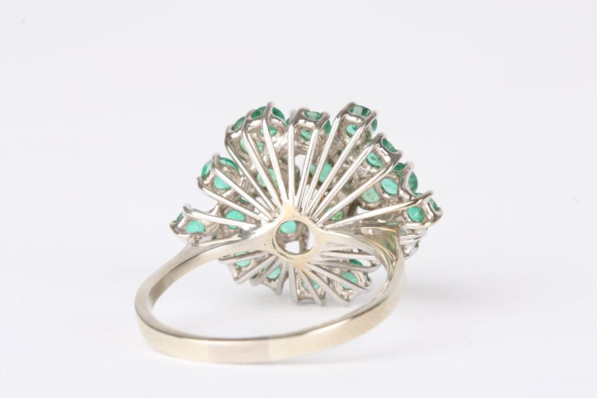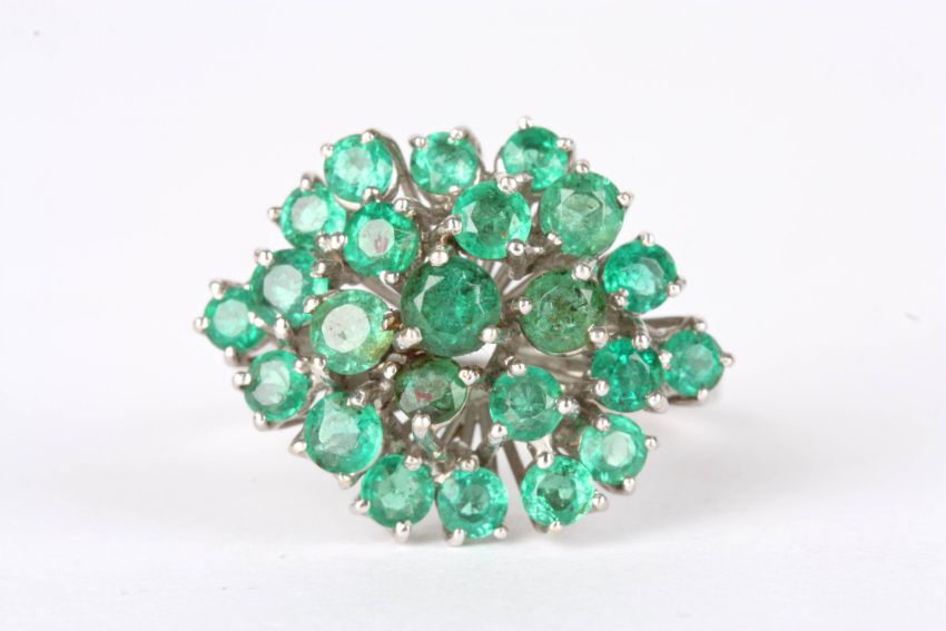 An 18ct white gold and emerald cluster ring set with 23 circular emeralds in a plain 18ct yellow gold shank with import mark., Approx 6.4 grams total.Condition: Generally good condition, one stone mount slightly bent.