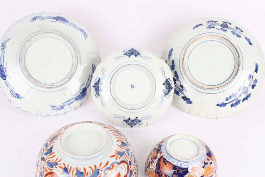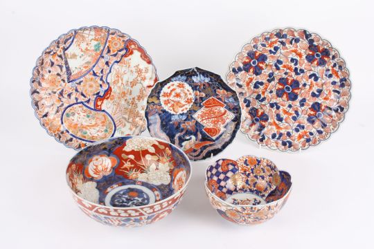 A collection of five late 19th century Japanese Imari porcelain dishes including two circular bowls, a small shell shaped dish and two larger chargers with wavy rims. (5), Largest 30.5 cm diameter.Condition: All appear in good condition, with only light wear and all ring nicely.