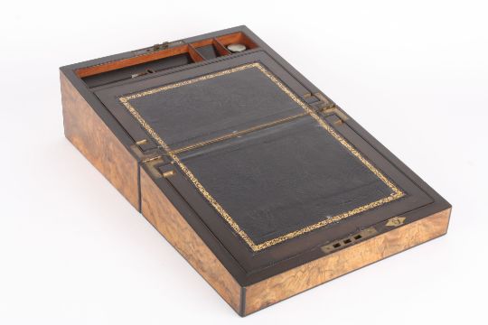 A late 19th century burr walnut veneered writing slope opening up to reveal pen tray and single ink bottle, width 30cmCondition: With small split to lid of veneer measuring approximately 7cm long