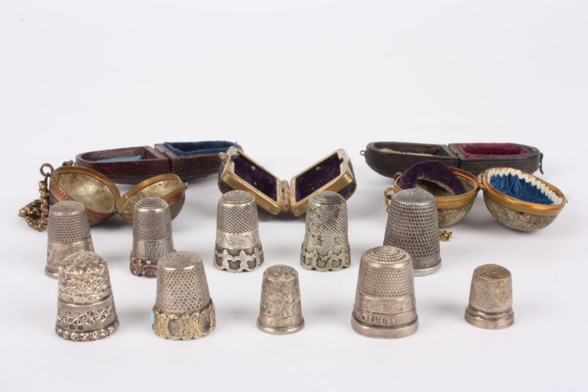 A collection of five silver cased thimbles and others a variety of different thimbles each contained within a different case, including a silver Bournemouth thimble contained in an oval case with repoussé decoration, another probably silver but unmarked studded with turquoise stones and contained in leather covered case, another in a fitted leather case and two others, and five others uncased some silver (10), Condition: In various conditions of wear. Some of the thimbles may have been mixed in to later cases - thimbles not necessarily in original cases