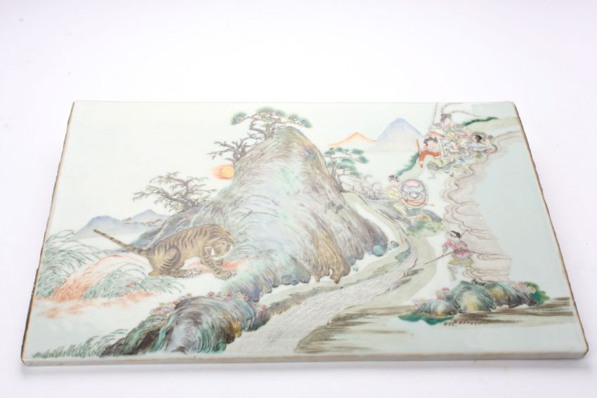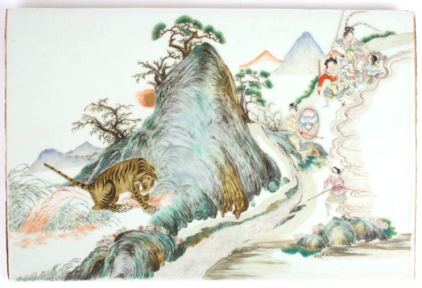 A hand painted Chinese tile of 'The Tiger Hunt' finely painted and decorated with crouching tiger at the foot of a mountainous landscape with hunting figures to the side holding shields and spears, 39 x 26cmCondition: In very good overall condition with no crazing, chips or cracks