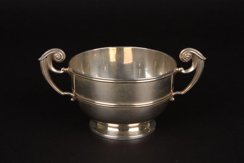 An Edwardian silver two handled sugar bowl hallmarked Sheffield 1903, with twin scrolled handles and circular foot., 5.4 ozt.Condition: Good condition, no damage, light wear.