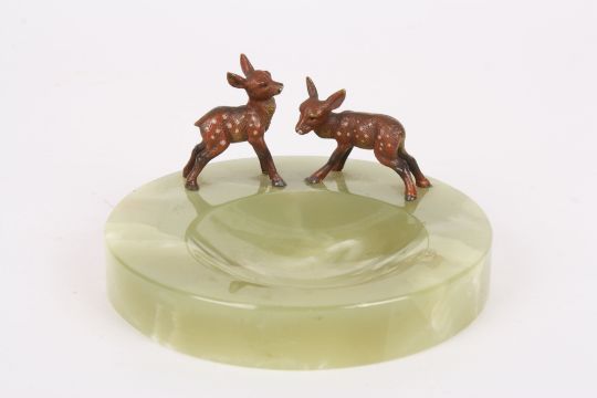 A 1930s onyx and cold painted pin tray mounted with a pair of cold painted spelter fawns, on a circular onyx base with recessed well., 12 cm diameter.Condition: Good condition.