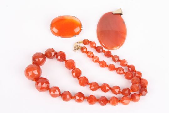 A graduated carnelian bead necklace the beads faceted and with gold coloured metal fastening, together with an oval shaped carnelian pendant and a silver mounted carnelian brooch (3), Condition: The pendant with chip to edge. The brooch with some wear.