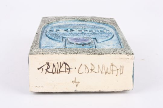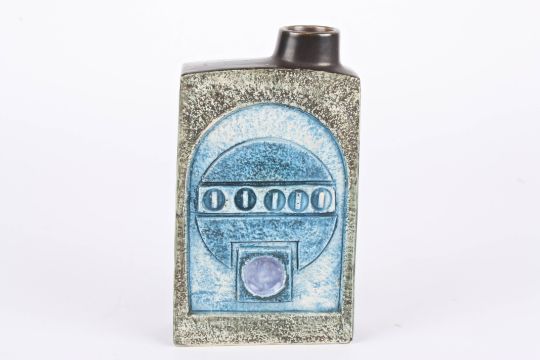 A Troika pottery chimney vase by Avril Bennett with Aztec stylised design, the base signed Troika Cornwall., 20.5 cm high.Condition: Good condition with no damage.