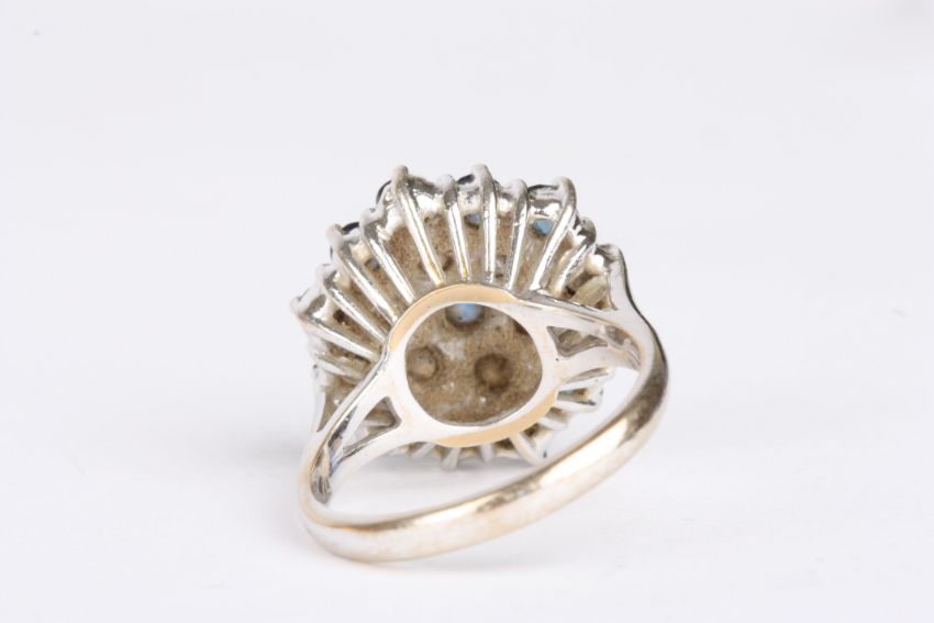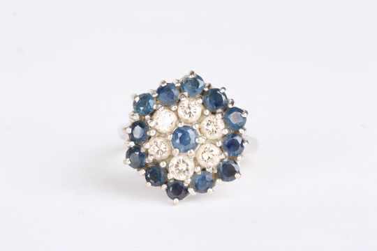 An 18ct white, sapphire and diamond cluster ring set with central sapphire surrounded by six brilliant cut diamonds and 12 further sapphires., Approx 8.4 grams.Condition: Appears in good condition with no damage.