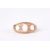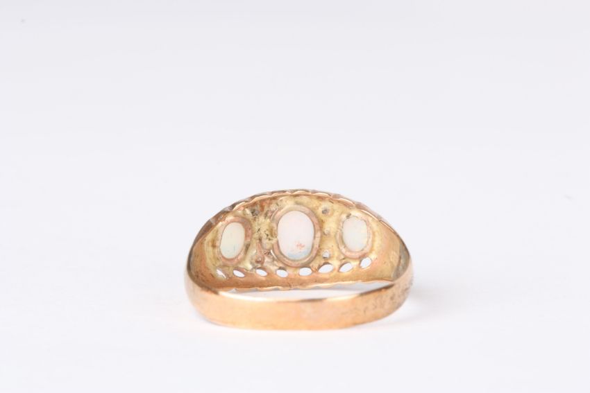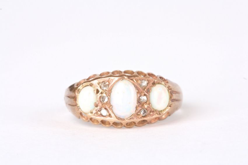 A 9ct gold and opal three stone ring set with three oval opals interspersed by six small diamonds in a pierced rose gold mount. , Approx 1.4 grams.Condition: Some thinning and wear, but no damage.