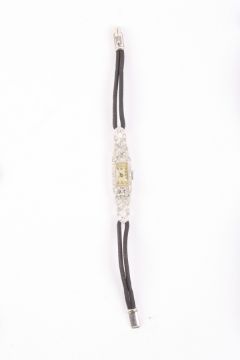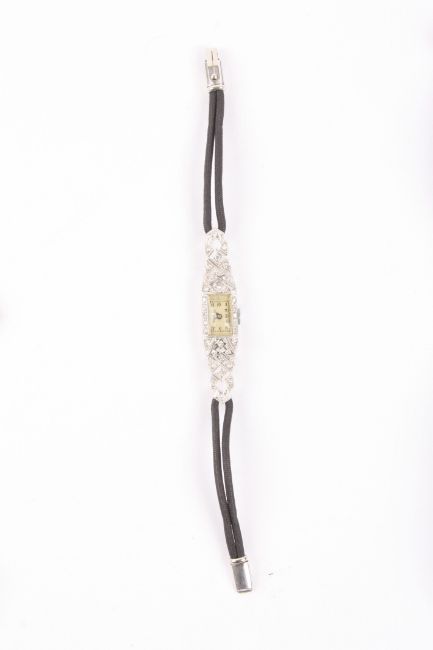 An Art Deco ladies diamond set cocktail wrist watch the rectangular dial set within a geometric fancy diamond set mount, with plaited fabric strap and white metal fastening, Condition: The dial in good condition. Overall in good condition. Movement not tested but appears to run.