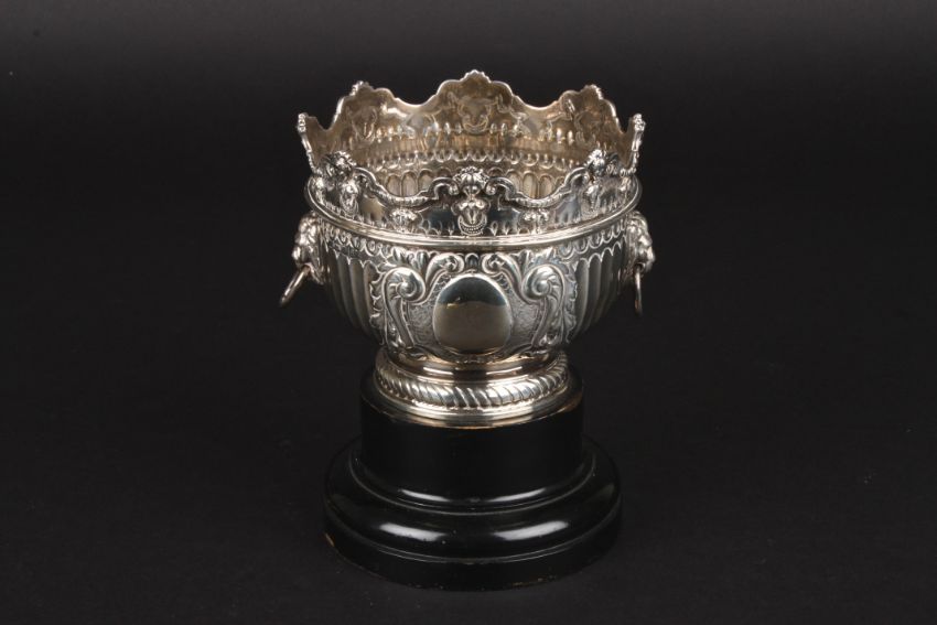 A small Victorian embossed rose bowl hallmarked London 1899, with scrolled mask moulded rim, semi-fluted bowl and lions head ring handles with a vacant cartouche and supported on an ebonised base, with retailers plaque Heming & Co., 9.6 ozt.Condition: Generally good condition, handles a little dented.
