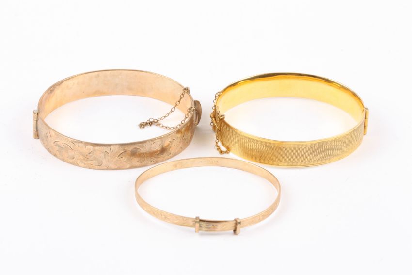 Two 9ct gold metal core stiff bangles with engine turned decoration, together with a 9ct rolled gold child's bracelet., Condition: Light wear, but no damage.