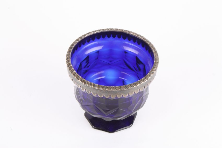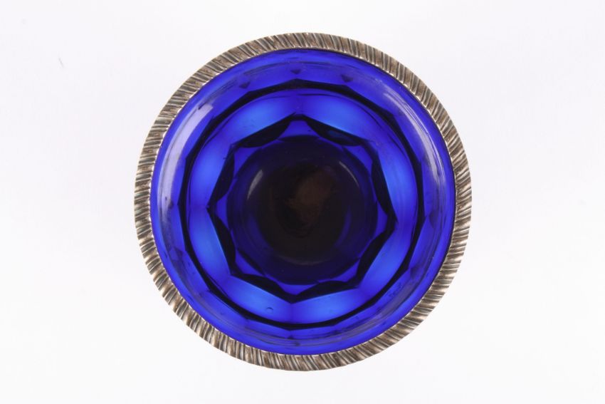 A George III Bristol blue glass and silver urn the gadrooned silver rim hallmarked London 1794, the blue glass facet cut body supported on an octagonal base. Maker: Peter & Ann Bateman., 13 cm high.Condition: Good condition, light wear to the glass.