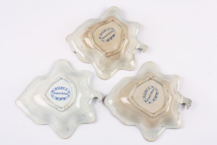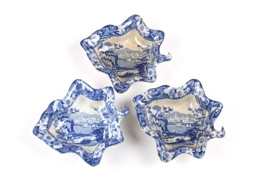 Three Riley's Semi-China blue and white pickle dishes of leaf shape form, transfer printed with landscape images and mountains to the background , Condition: Some discolouration to two dishes and chipping to edge of one dish.