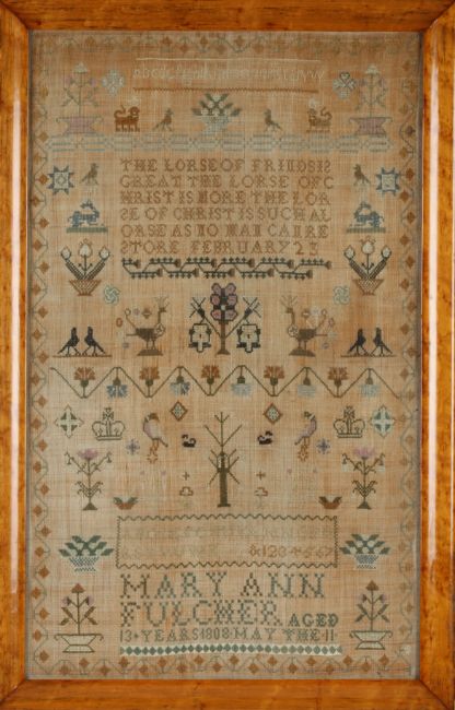 A large early 19th century sampler dated 1808, embroidered in coloured threads by Mary Ann aged 13 and depicting birds and animals including, peacocks and rabbits, within a maple frame, overall 73 x 47cmCondition: No major holes or damage but some staining throughout although images appear clear