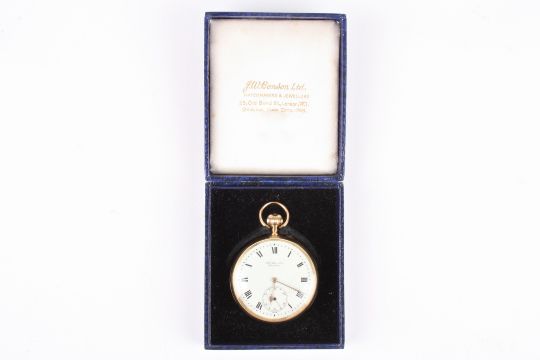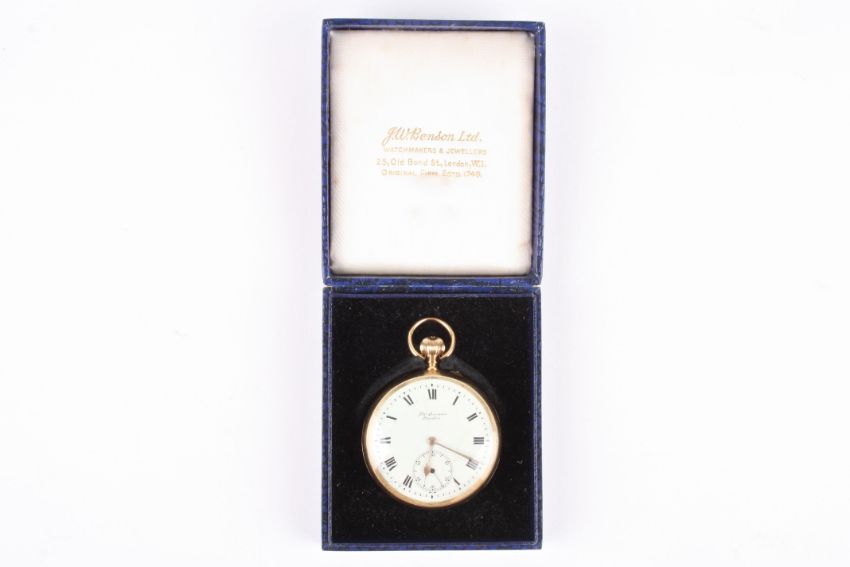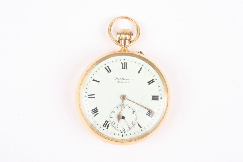 An 18ct gold J W Benson 'The Field' open face pocket watch hallmarked London 1917, the white enamel dial with black Roman numerals and subsidiary seconds dial, the movement signed and numbered G3794, engraved initials to the case back. In Benson box. 108 grams.Condition: Numerous cracks to the enamel dial, movement fully would but does not run, balance turns freely but only for a second or two.