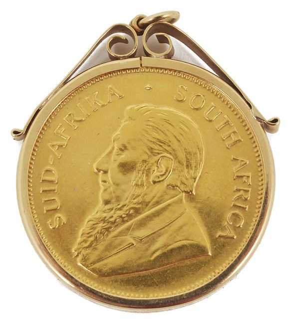 A 1975 South African Krugerand in a 9ct gold mount. Total weight including mount 37.8 grams.Condition: Light wear, generally good condition.