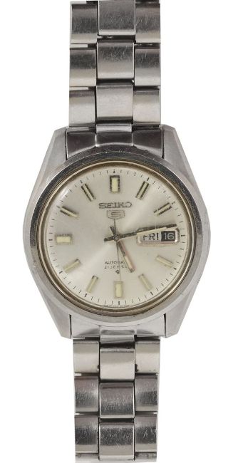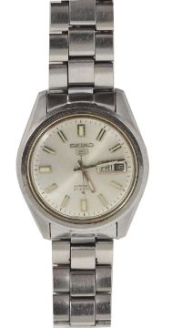 A Seiko automatic stainless steel wrist watch the silvered dial with luminous baton numerals and date aperture, on a steel link strap, automatic 21 jewel movement, numbered 165279 to case back. 38mm case.Condition: Worn condition, glass scratched, appears to be in working order.