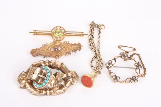 An Art Deco peridot set 15ct gold brooch with central circular scroll design together with a small Georgian intaglio seal of a soldier on horseback, a ruby and diamond brooch and and two other Victorian gold brooches. (5) Total weight 23 gm.Condition: Some damage to scroll brooch, slight dent to ruby and diamond brooch, wear to circular pearl pin