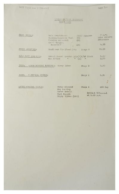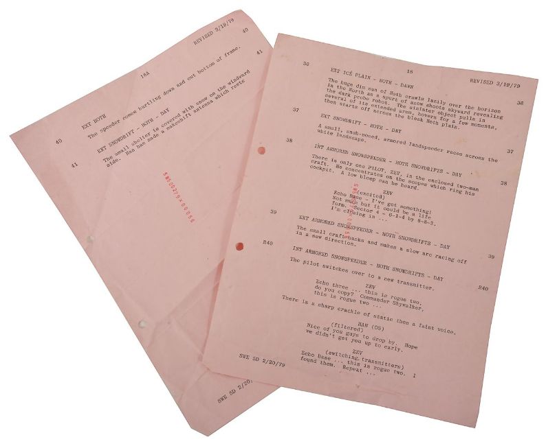 STAR WARS INTEREST: Two sheets of revised script for Empire Strikes Back (No's 18 and 18a) dated 3/19/79 and featuring Han Solo, and call sheet No 2 possibly for Star Wars the first film Condition: Pages crumpled and the former with punched holes, but no major tears or damage. Just wear with age.