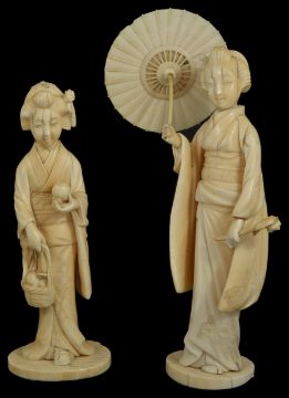 Two Japanese ivory okimono figures of girls early 20th century the first standing in traditional dress holding an umbrella, with carved character marks to base, the second holding a basked or fruit the height of the former 8.5cmCondition: The first with cracks, particularly to the length of the robe. The right arm and umbrella are loose although can be repaired. Some minor chips - overall in fair condition. The second with broken base and surface cracks
