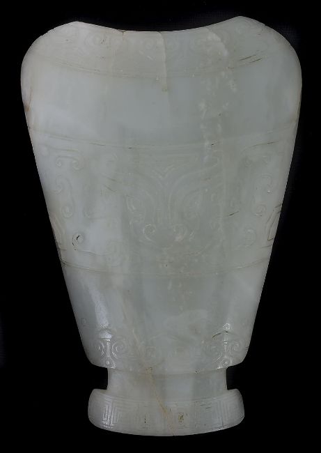 A large Chinese pale mottled celadon jade plaque carving in the form of a vase with carved archaic and scroll bands height 17 cm.Condition: Cracks within the stone