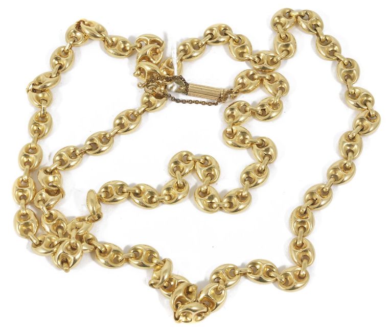A Continental gold anchor link long chain, with fancy push clasp fastening, marked .750 for 18ct gold. Weighs approx. 44gms.Condition: Good condition overall