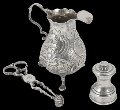 A George III embossed silver cream jug hallmarked London c.1776, with scrolled handle and supported on three feet, together with a pair of sugar nips and a silver nutmeg grater. (3) Jug 2.9 ozt.Condition: Jug with dented foot and worn marks, nips in good condition and few dents to grater.