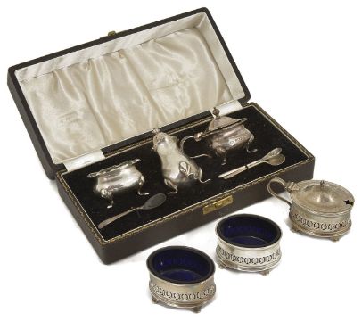 A silver cased cruet set together with an uncased example with pierced acanthus leaf decoration Condition: