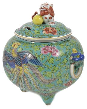 A 20th century Chinese famille rose incense burner and cover the lid crested with a dog of foe, the body decorated with birds on a green ground strewn with flowers and trailing foliage, supported on three feet. 15.5 cm high.Condition: Good condition with no damage.