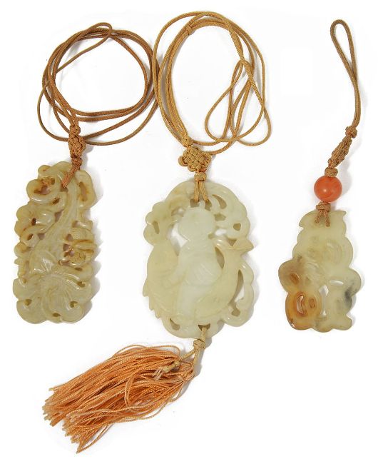 Three Chinese hardstone pendants the pierced and carved pendants of various form, one with an agate bead and carved as a Chinese character, another as a boy riding a carp, and the third of a scrolled floral design, all with silk ties the longest pendant 6.8cmCondition: All in fair condition