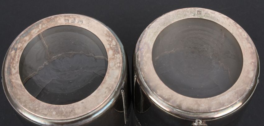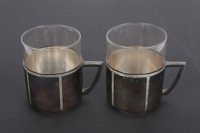 A pair of WMF silver plate and glass mugs the clear glass liners in simplistic holders with plain field and beaded decoration. Condition: Good condition, a little tarnished.