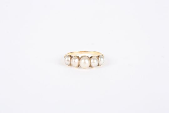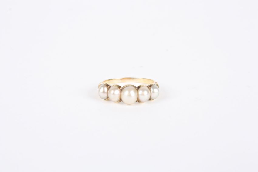 An early Victorian five pearl set half hoop ring, the pearls graduating in size to either side and in enclosed mount. Yellow metal mount size MCondition: Variation in pearl colour, slight, otherwise no defects except wear commensurate with age