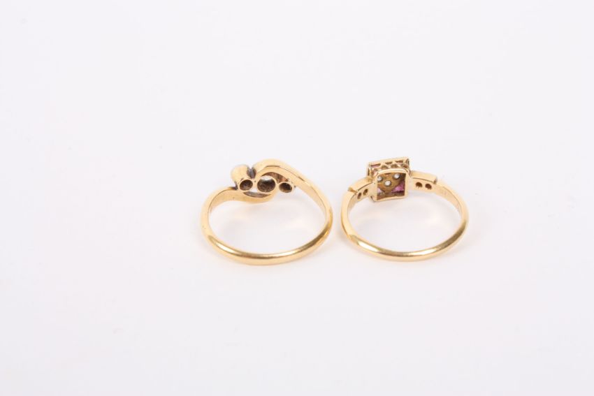 An Art Deco ruby and diamond square set ring of geometric design, 18ct mount, and a three stone diamond set twist ring, 18ct mount. (2) Former sized J, latter KCondition: One triangular ruby lighter in colour and with chip.