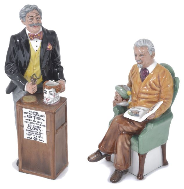 Two Royal Doulton pottery figures 'The Auctioneer' HN2988, c.1986, and 'Pride and Joy' HN2945, c.1983. 22.5 and 18.5 cm high.Condition: Both in good condition with no damage.
