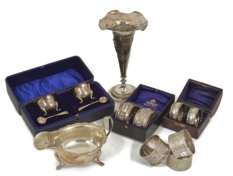 A large collection of assorted silver items including, three napkin rings (two matching), a silver sauce boat, one cased cruet set, two cased napkin sets, and an Eastern white metal trumpet vase. Condition: Salts complete with spoons. Overall in fair condition.