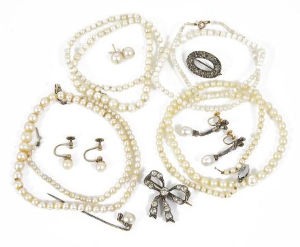 Four graduated cultured pearl necklaces, a pair of silver paste set drop earrings, other earrings, two Edwardian paste set brooches a similar stick pin. Condition: Two necklaces clasps missing