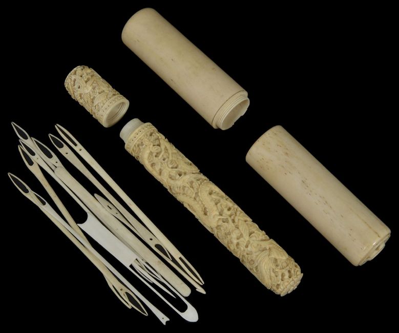 A cylindrical ivory needle case the larger plain outer case opening to reveal a Cantonese carved ivory case carved with dragons, birds and foliage, with vacant cartouche and lid unscrewing to reveal needles or spilikins large case length 7cm inner case length5.5cmCondition: The large outer case has a large crack measuring 8cm, but the inner carved case is in very good condition with no major chips cracks or damage.
