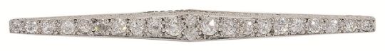 An Art Deco diamond set line brooch, the brooch tapering to either end and with scroll engraved white metal mount, pin stamped 9ct in an associated Garrard box Approx. 7.5cms. acrossCondition: Possibly a replacement pin and some slight earlier stone resetting. Overall good condition