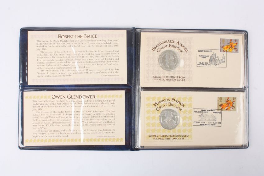 Great Britons Medallic First Day Covers and Coins a set of four silver and first day cover sets, Robert The Bruce, Owen Glendower, Henry V and Edward the Black Prince, in a presentation folder, produced by John Pinches Ltd. Condition: Good condition.