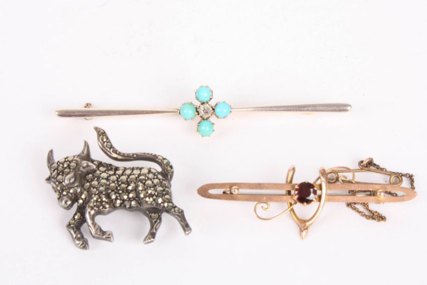 An Edwardian turquoise and diamond set brooch of quatrefoil design with central diamond, a 9ct gold and garnet wishbone brooch and a silver and marcasite 'bull' brooch. (3) turquoise brooch 7 cm.Condition: Garnet brooch replacement pin