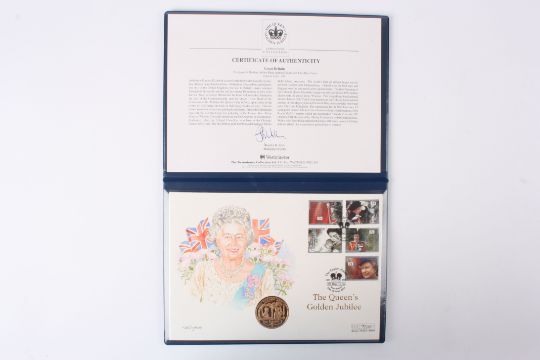 A Queens 2002 Golden Jubilee £5 gold coin presentation set with first day cover, in a presentation folder, produced by Westminster Mint. Condition: Good condition.