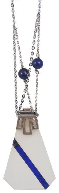 An Art Deco white metal mounted hardstone pendant of geometric design, with adjustable slide pulley chain, the chain with small lapis beads. Pendant measures 4.5 cm.Condition: Enamel decoration part missing