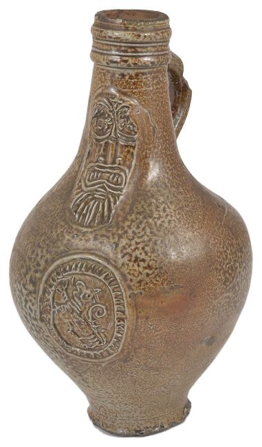 An unusual 17th century salt glaze bellarmine jug with rampant lion crest to the body, the neck with stylised mask decoration, simple loop handle. 23 cm high.Condition: Large chip to handle, few nibbles to foot rim, no other damage.
