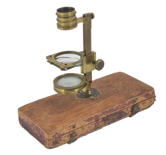 A Victorian brass travelling microscope by Banks of London the stem signed 'Banks, London, Math Inst Mak' to the Prince of Wales',in a fitted case stand. Condition: Thumb wheel is hard to adjust and a little loose, no major damage, a little tired in general.