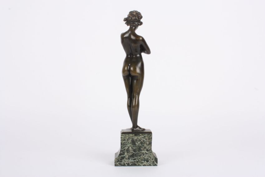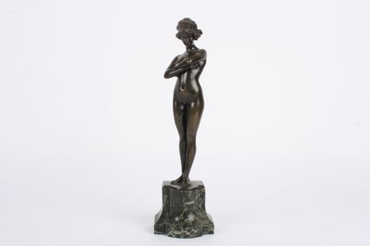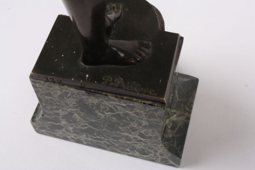 Paul Phillippe (20th century) French A bronze figure of a nude woman, stood with arms crossed on a shaped base. Signed P. Phillippe, and supported on a marble base. 32 cm high.Condition: God condition and patina, few light age-related marks and wear in places.