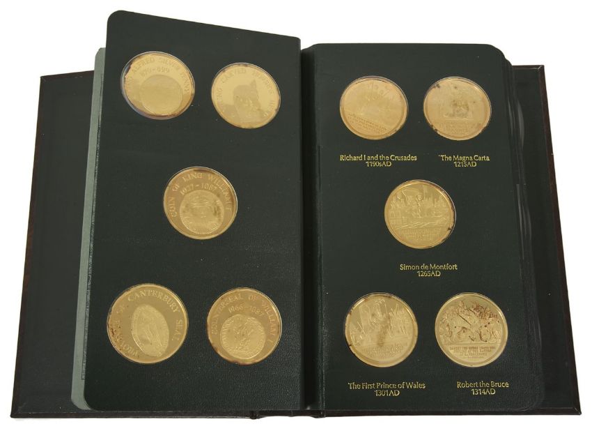 A History of the English-speaking Peoples A set of 50 silver gilt commemorative coins produced by the Danbury Mint, limited edition number 722/2500, dated 1971. All presented in a display album. Approx 64 ozt.Condition: Good condition.
