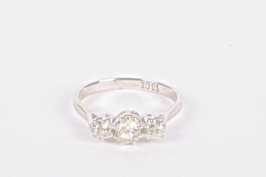 A three stone diamond set ring, the central diamond size just under 0.50 ct and flanked by a smaller diamond to either side, the white mount marked 18ct Size OCondition: Slight edge wear to shank, otherwise overall good