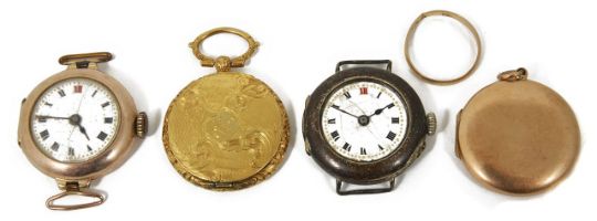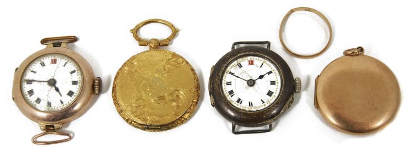 A Georgian hinged picture locket with engraved decoration, unmarked, a 15ct gold circular hinged picture locket, a 9ct gold cased ladies watch. a gold ring and a silver wristwatch. (5) Condition: Lockets in good order remaining items a.f.